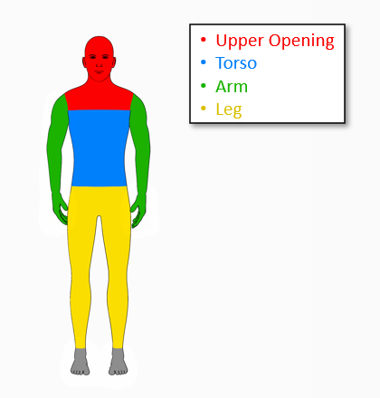 Torso is the remaining area above the waist, Leg is below the waist. (Typically indicated by the bottom of the jacket.)